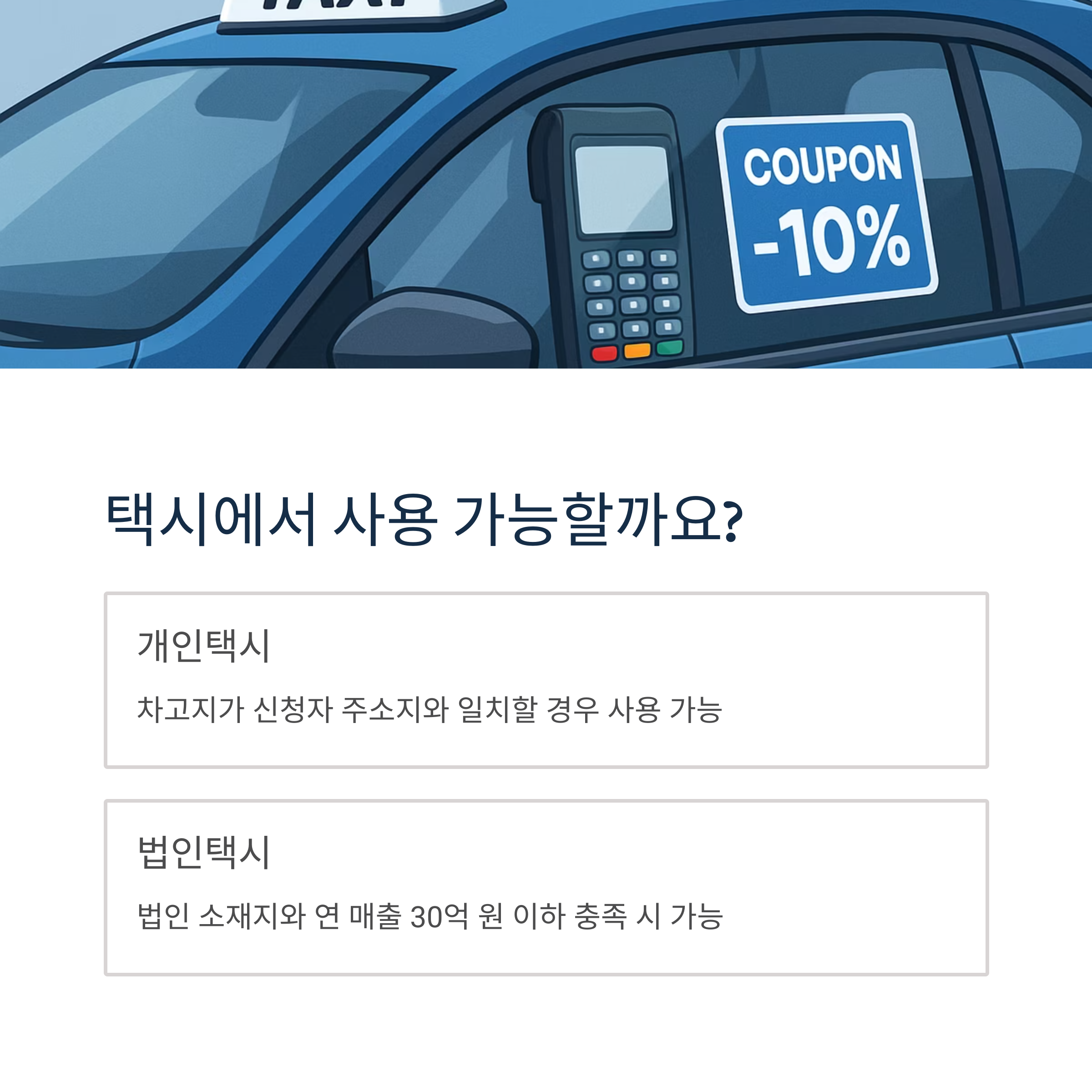 - 법인택시: 법인 소재지와 매출 요건(연 매출 30억 원 이하) 충족 시 사용 가능