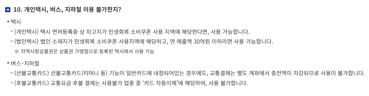 - 불가 사유: 교통카드 결제는 대부분 별도 계좌에서 자동이체 처리되며, 소비쿠폰 적용이 되지 않음
