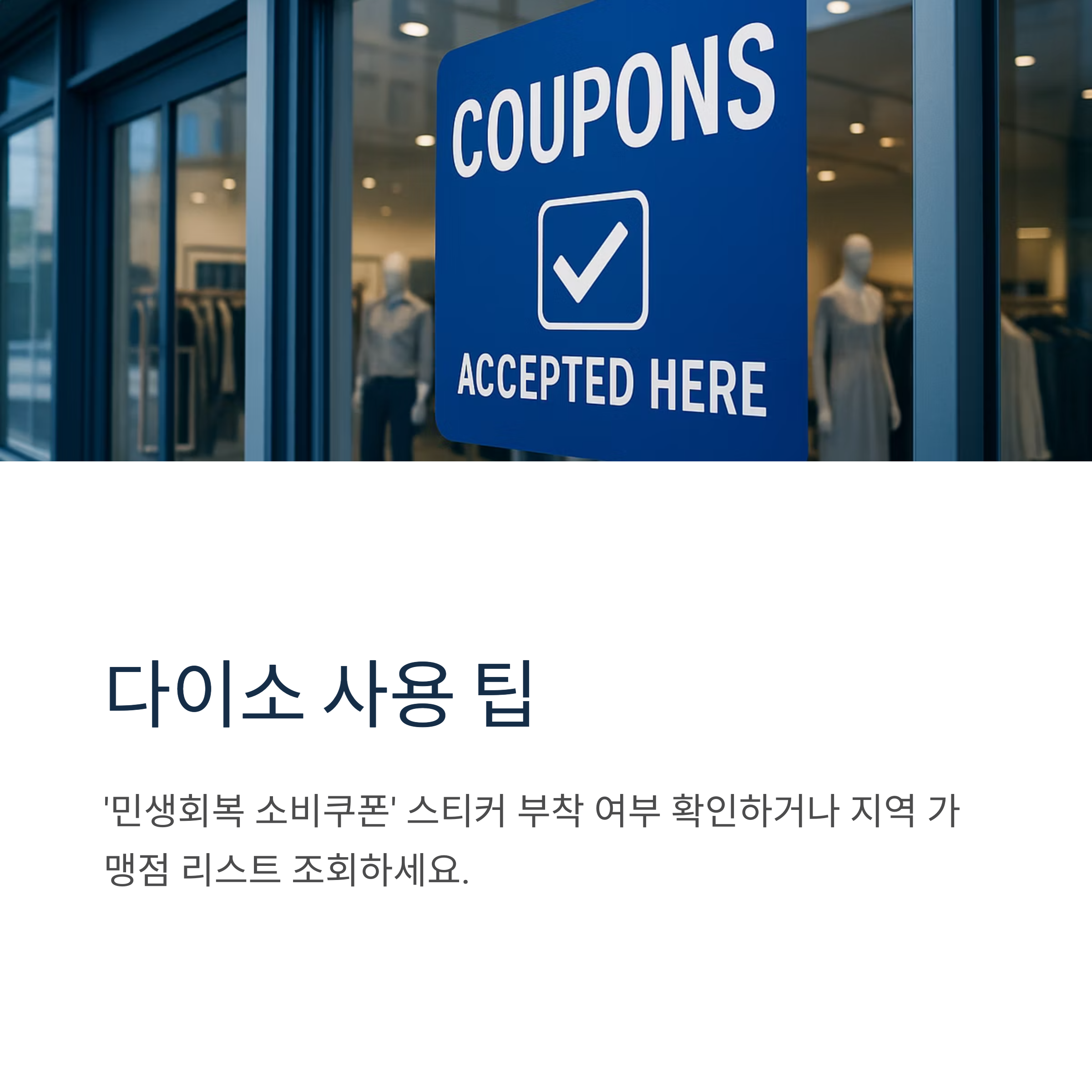 📌 팁: 다이소에서 사용하고 싶다면, 매장에 '민생회복 소비쿠폰' 스티커가 부착되어 있는지 확인하거나, 해당 지역 가맹점 리스트를 조회하세요.
