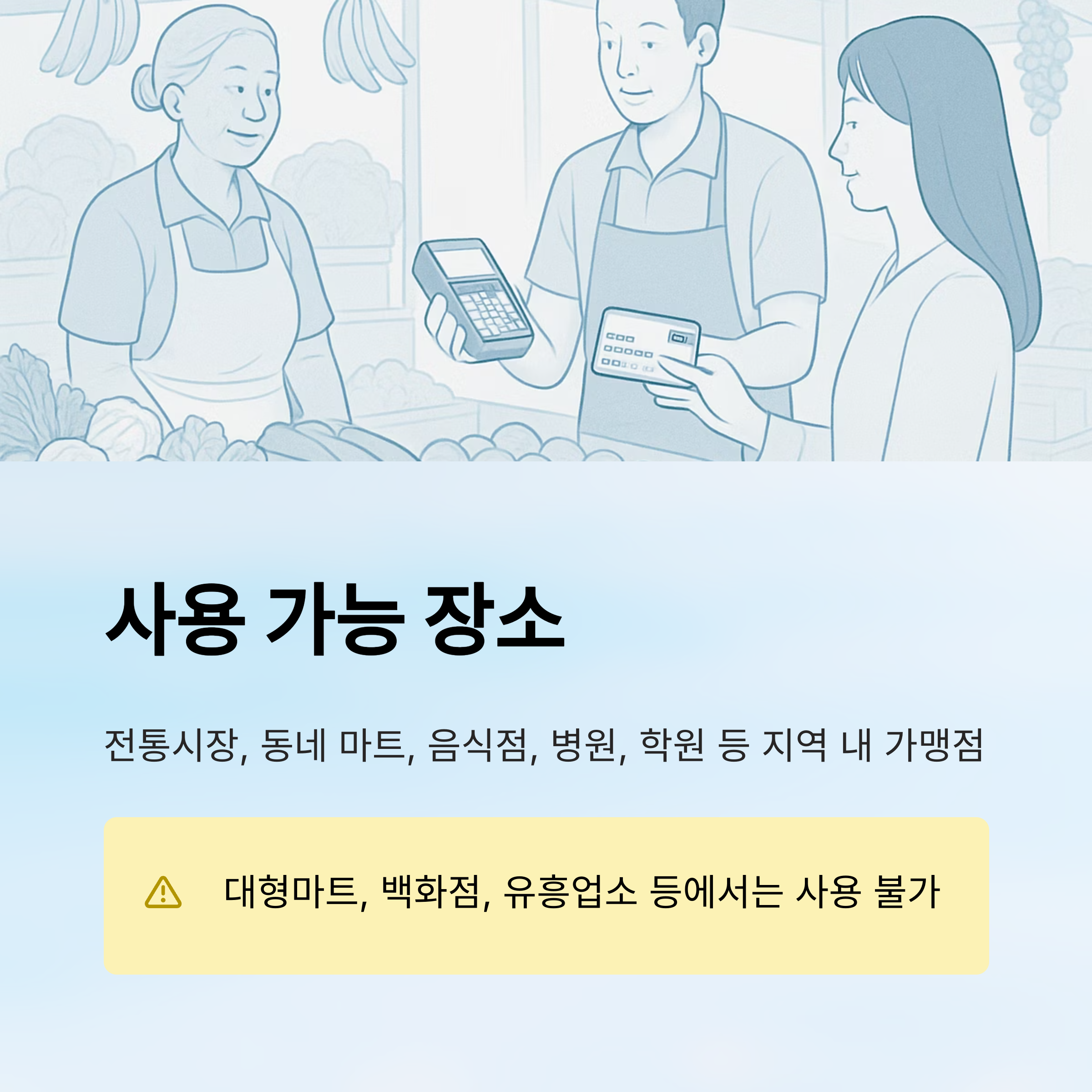 해당 지역 내 전통시장, 음식점, 병원 등 가맹점에서만 사용이 가능하며, 구매 시 5~15%의 할인 혜택을 받을 수 있습니다.