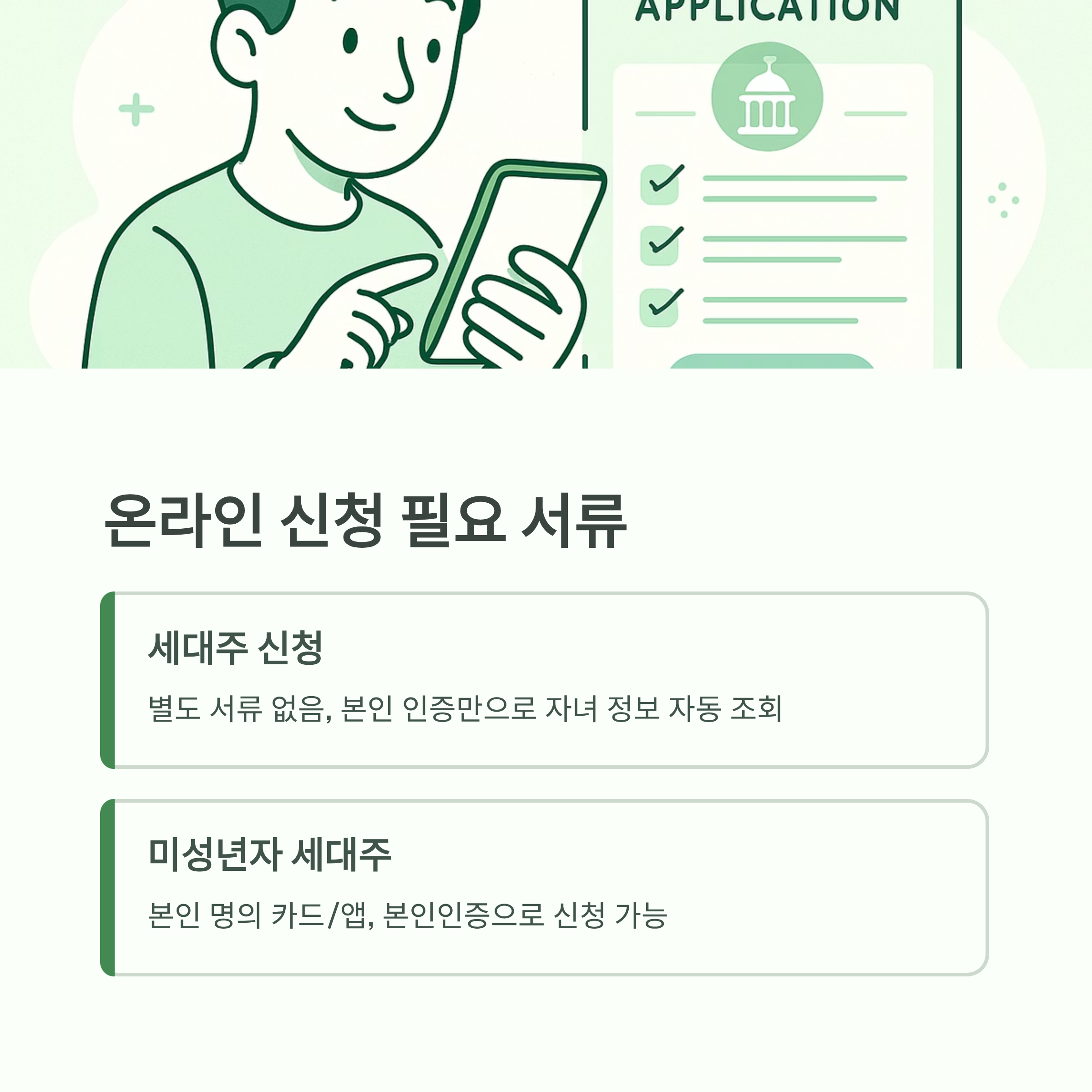 - 세대주 신청: 별도 서류 없음. 본인 인증만으로 자녀 정보 자동 조회