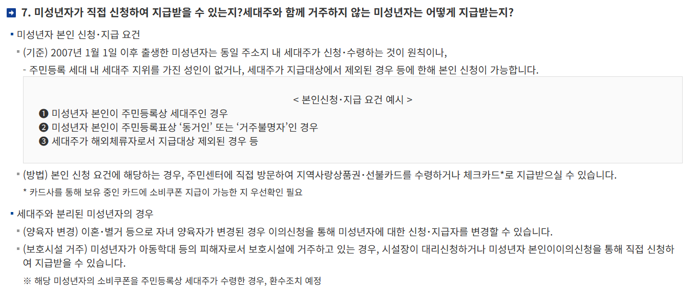 세대주가 아닌 미성년자는 원칙적으로 신청이 불가하며, 중복 수령을 방지하기 위해 카드사와 지역사랑상품권 중
