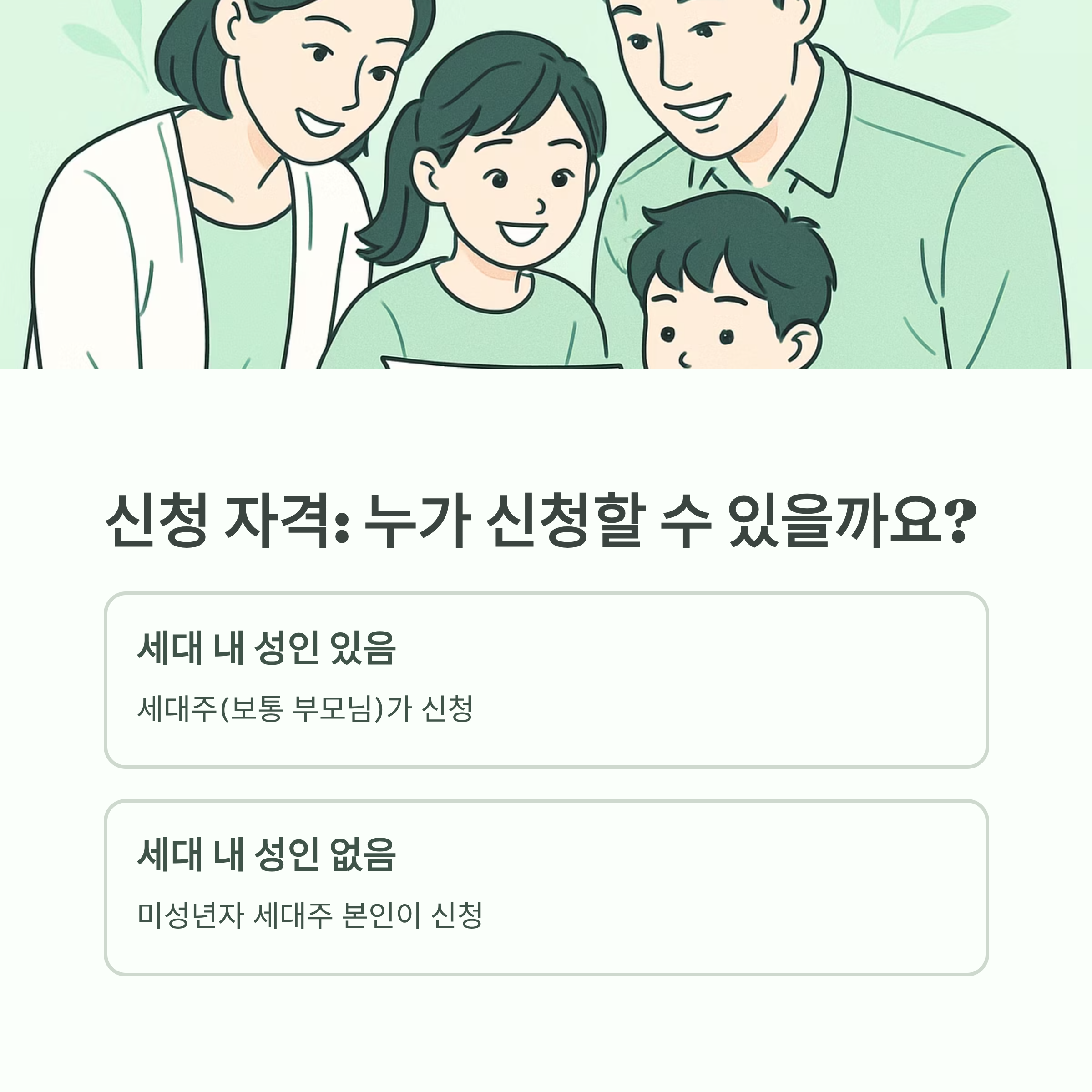 세대 내 성인이 있는 경우 세대주가 대신 신청하며, 성인이 없는 독립 세대의 미성년자는 본인이 직접 신청할 수 있습니다.