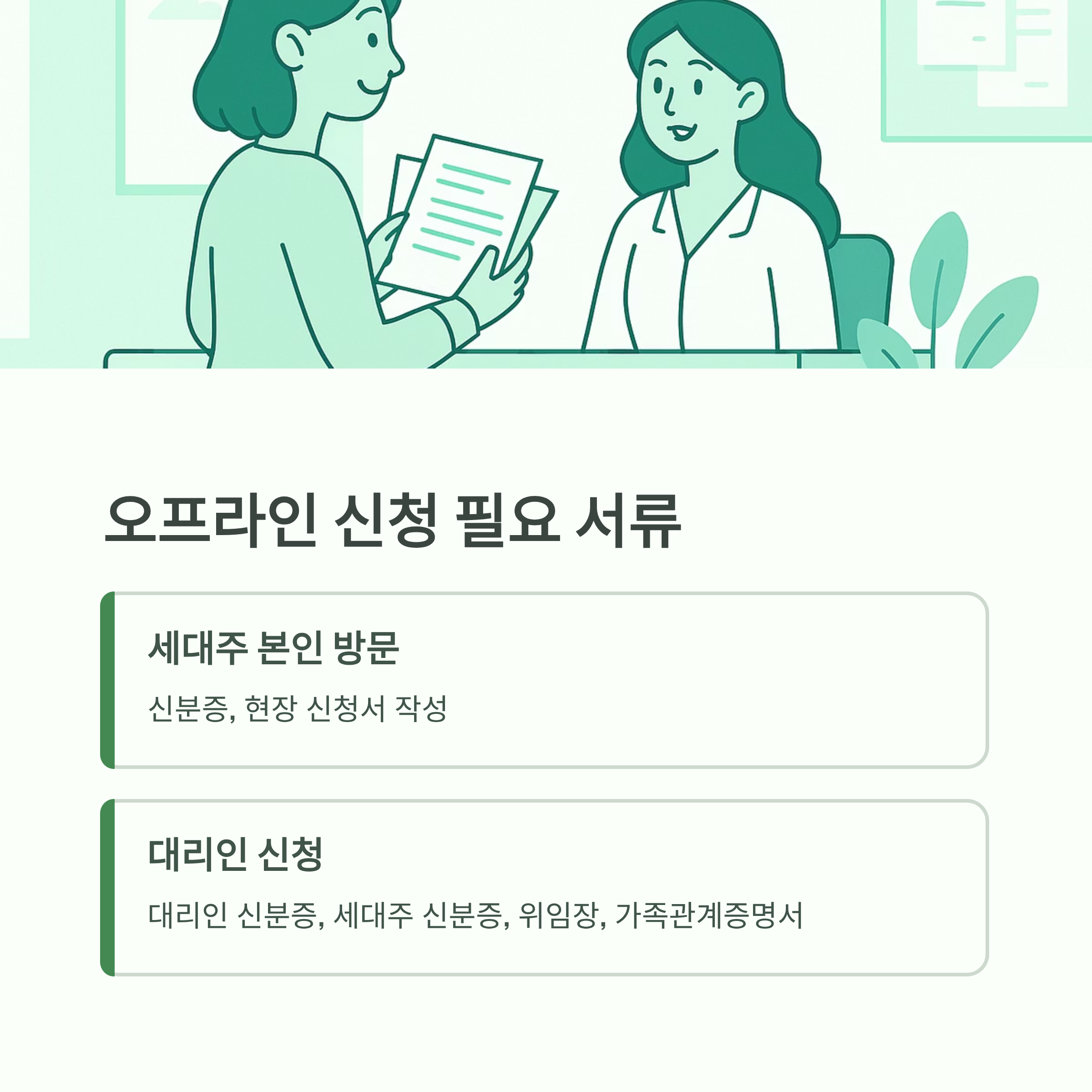 📌 오프라인 신청 시에는 신분증 지참 필수, 대리 신청 시에는 위임장·관계서류도 함께 준비하세요.