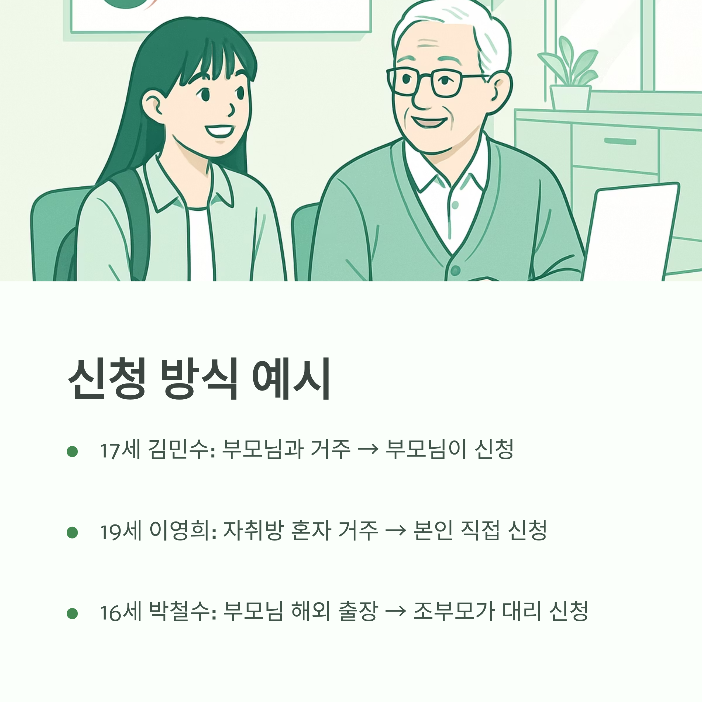 - 17세 김민수 학생: 부모님과 함께 거주 → 부모님(세대주)이 신청