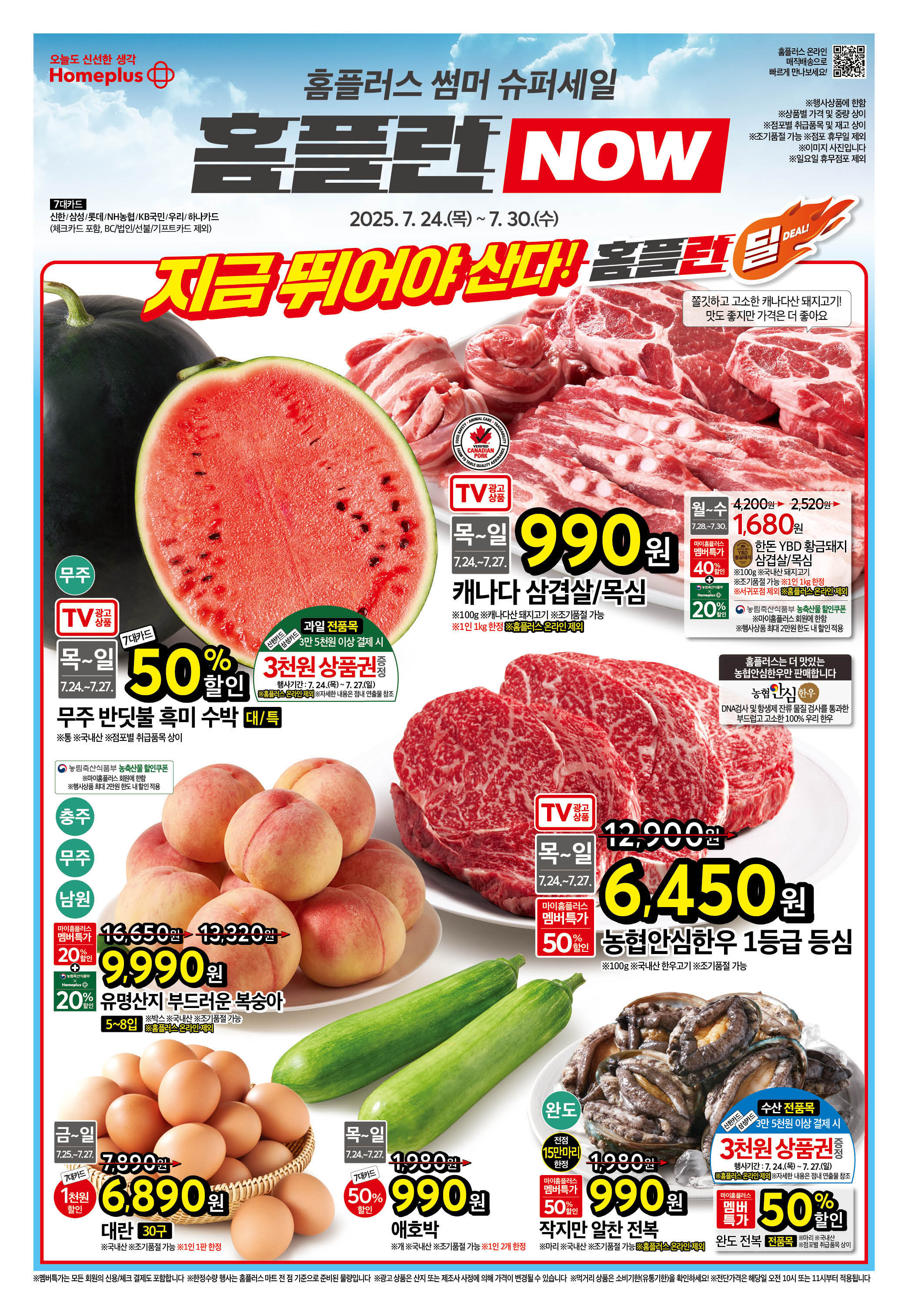 2025년 7월 24일부터 30일까지, 홈플러스에서 '홈플런나우'라는 이름으로 대규모 홈플러스 전단행사를 진행합니다.