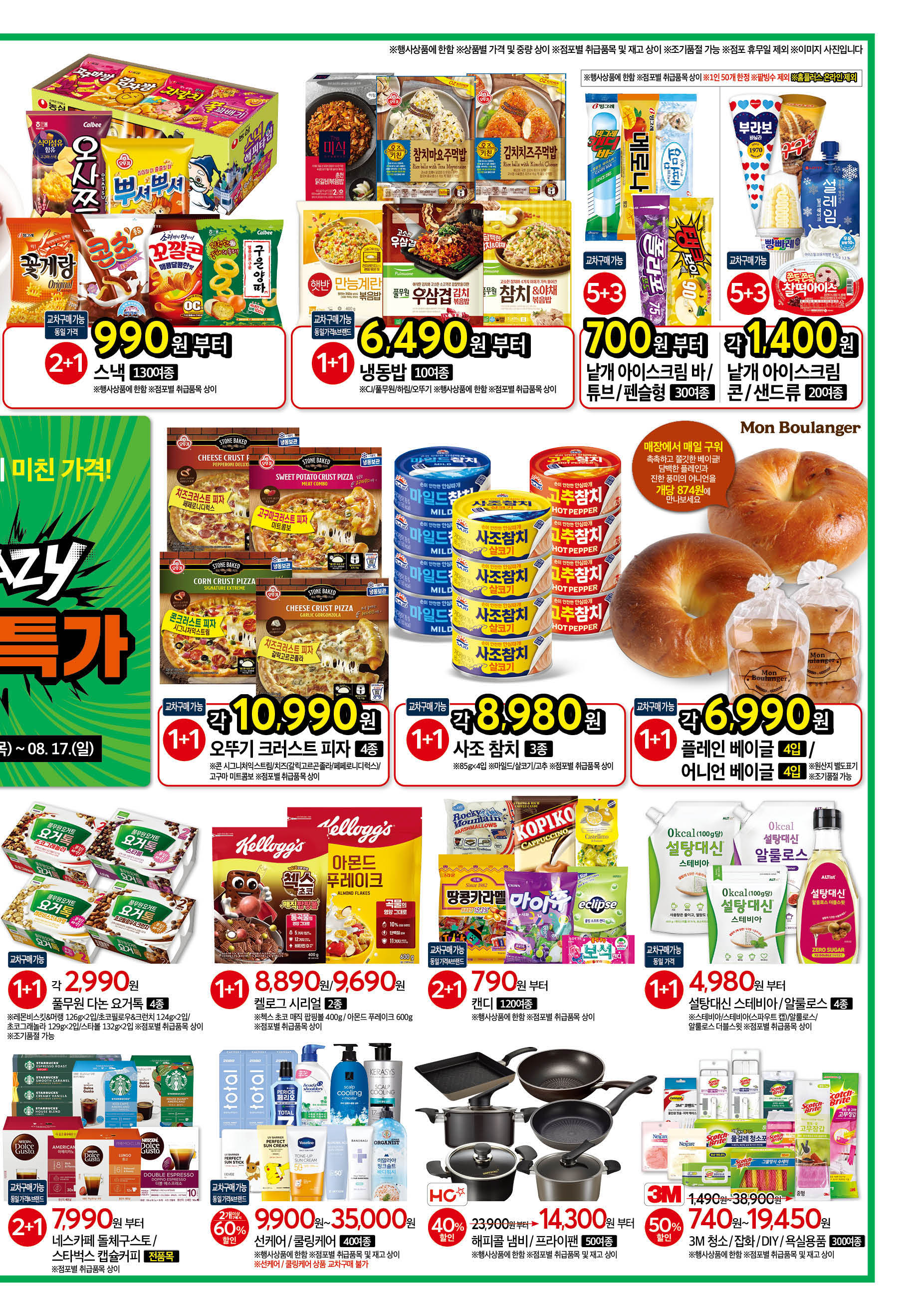 냉동밥, 피자, 참치, 음료 등은 1+1, 2+1, 50% 할인 등 다양한 혜택이 적용됩니다.