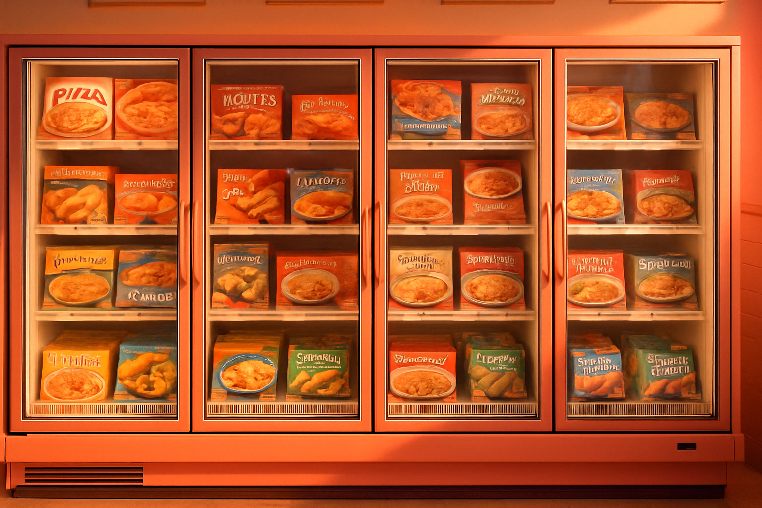 간편식과 냉동식품 코너에서는 컵밥, 냉면, 분식, 피자, 햇반, 떡볶이 등이 할인가로 제공됩니다.