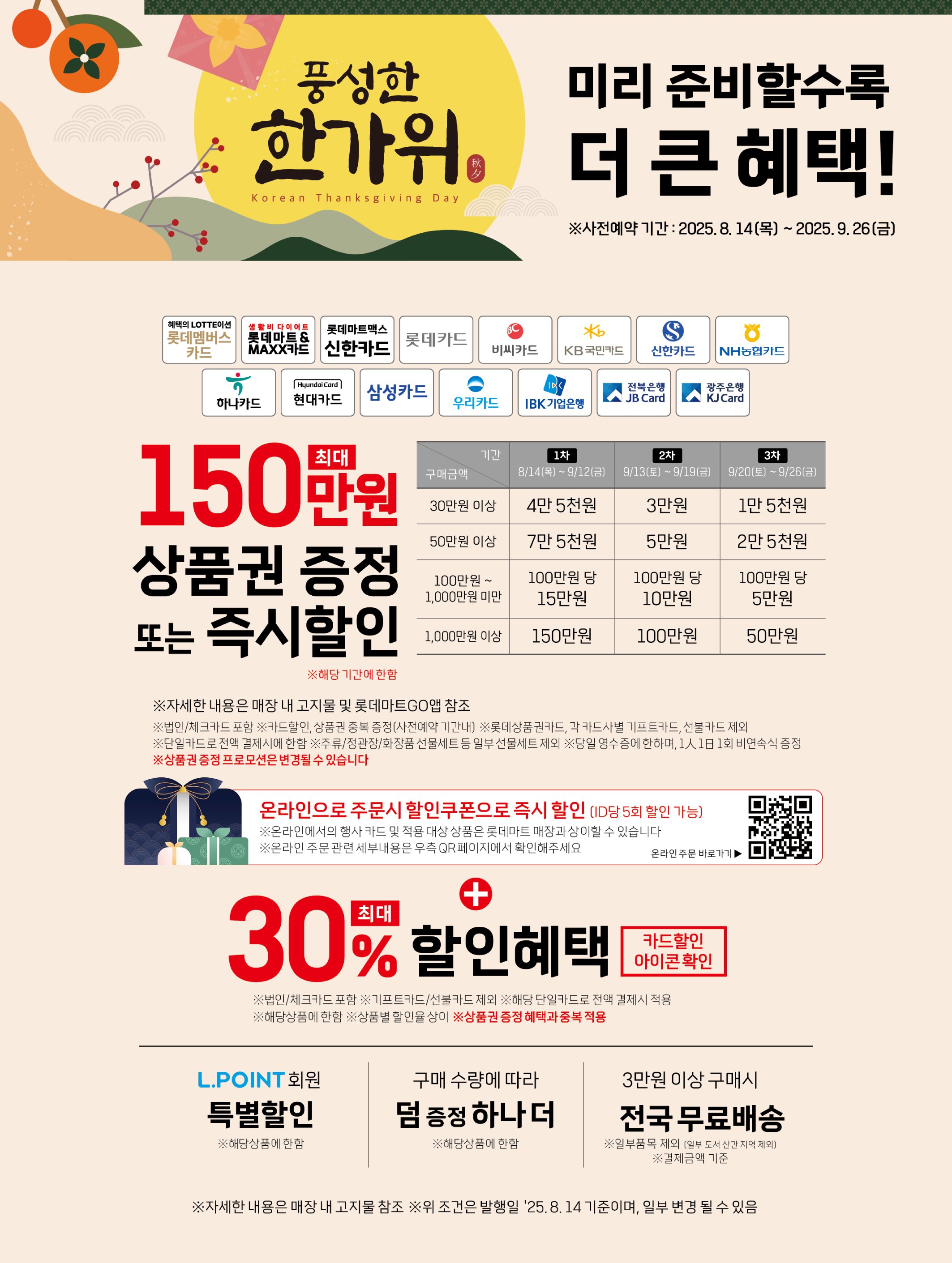 행사카드로 결제하면 최대 30% 할인 혜택을 받을 수 있으며, 구매 금액에 따라 최대 150만원 상당의 상품권도 증정됩니다.