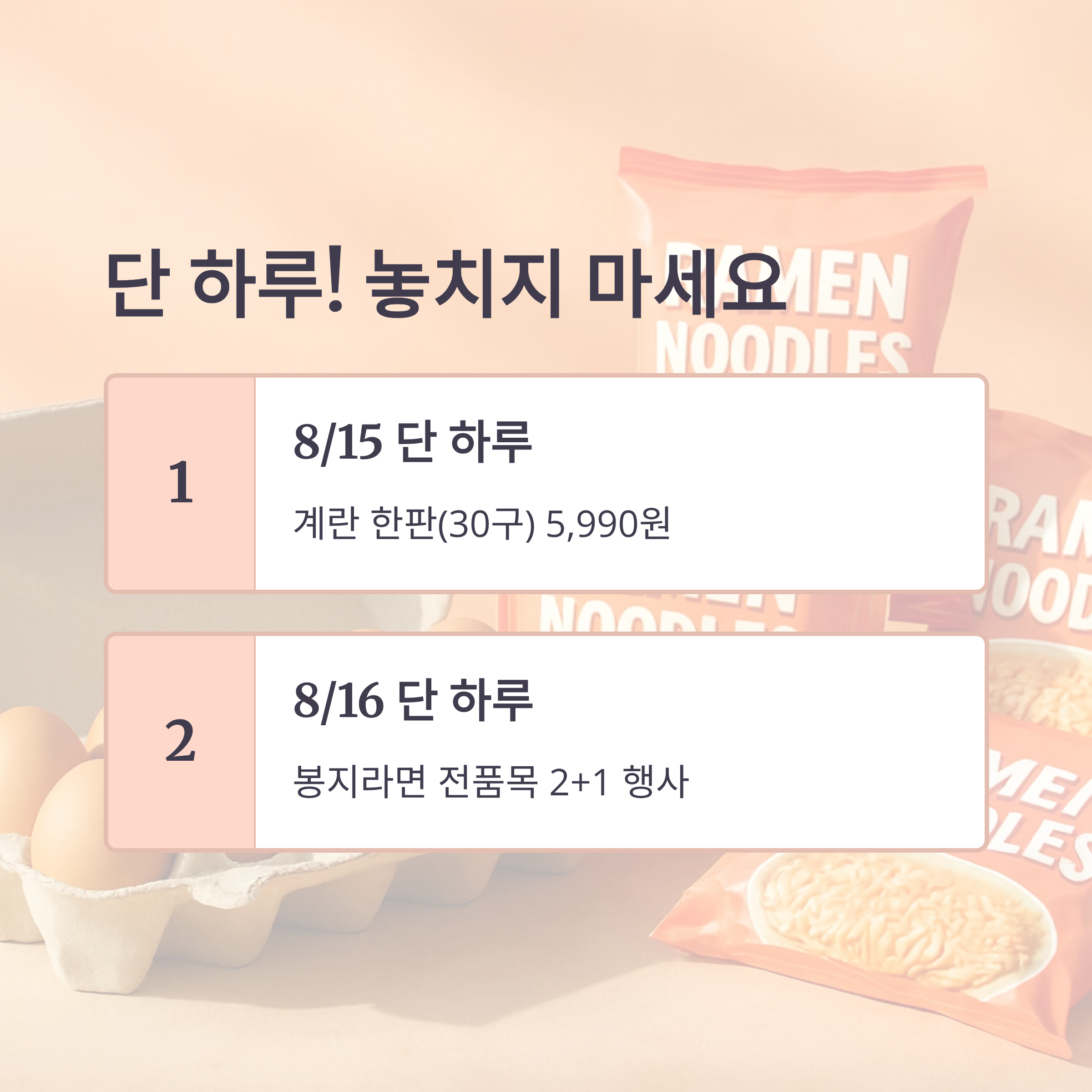- 봉지라면 전품목: 2+1 행사 (8/16)